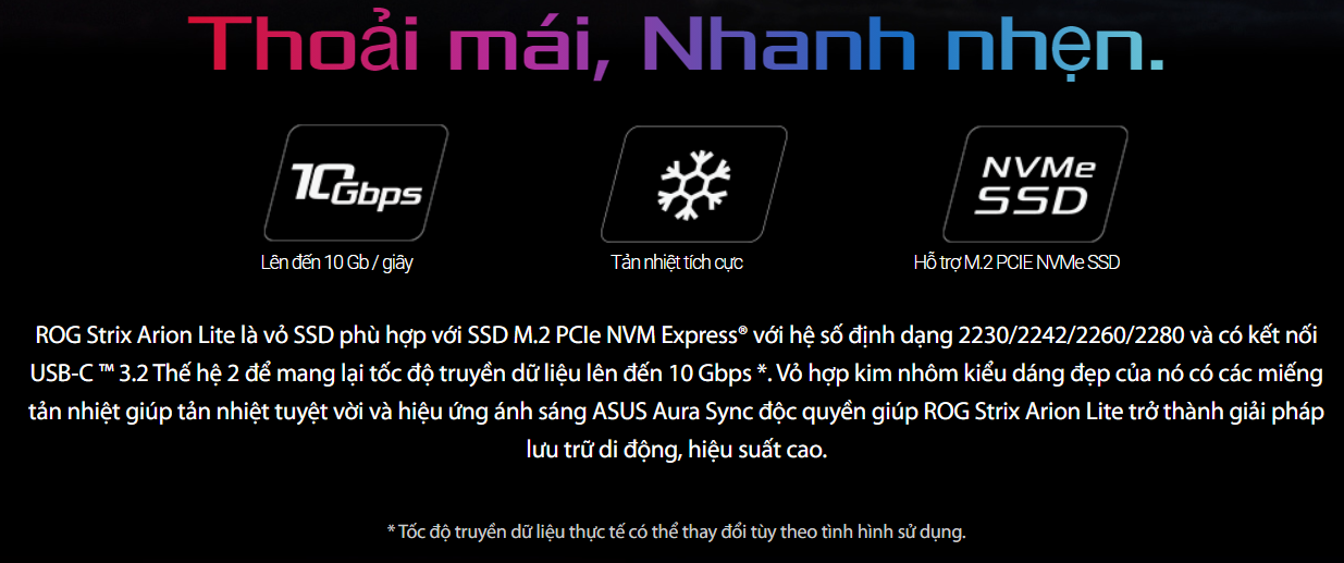 Vỏ ngoài SSD ROG Strix Arion Lite M.2 NVMe — USB3.2 GEN2 Type-C (10 Gbps), Cáp USB-C to C, Không có tuốc nơ vít, Bao gồm miếng đệm nhiệt, Phù hợp với khóa PCIe 2280/2260/2242/2230 M / Phím B + M