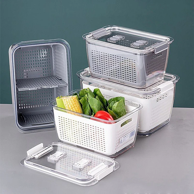 Hộp Đựng Thực Phẩm dễ dàng bảo quản rau củ để Tủ Lạnh 2 Lớp Có Lỗ Thoát Nước, Có Khóa Thoát Khí - Hàng Loại 1