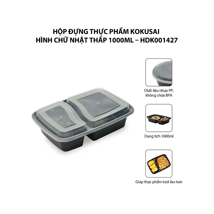 Hộp đựng thực phẩm Kokusai hình chữ nhật thấp 1000ml, dùng được cho lò vi sóng – HDK001427 - Hàng chính hãng