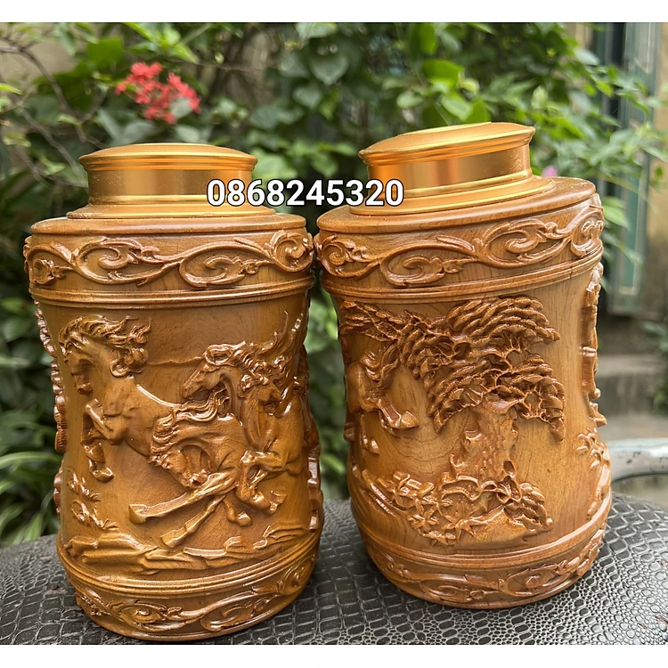 Hộp đựng trà (chè) khắc bát mã bằng gỗ ngọc am thơm nức kt cao 20×12×12cm