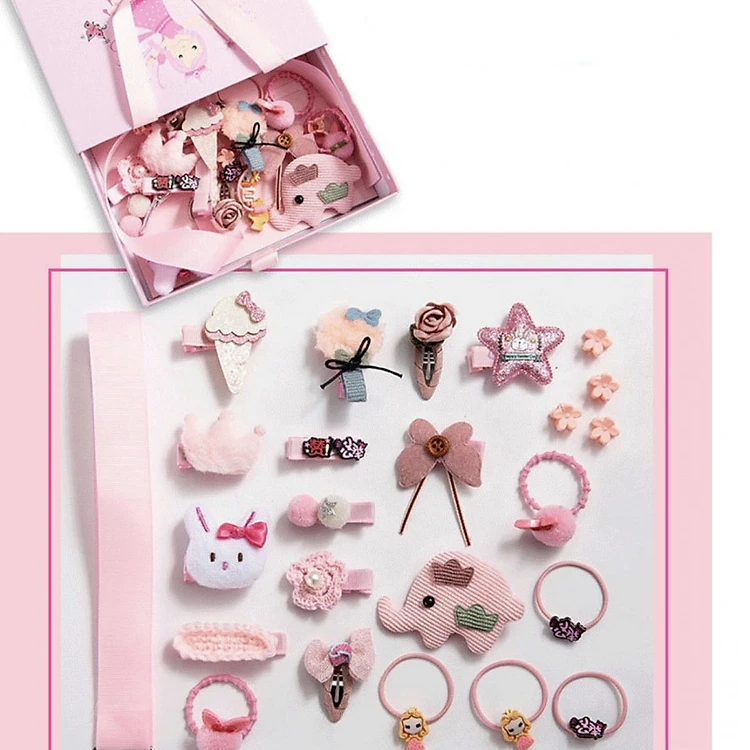 Hộp kẹp tóc bao gồm 24 chi tiết: 1 kẹp tóc hình nơ màu hồng thẫm, 2 kẹp tóc hình bông hoa bằng vải và len, 1 kẹp tóc thỏ con dễ thương, 1 kẹp tóc hình con bướm, 1 kẹp tóc hình ngôi sao lấp lánh, 1 hình vương miệng, 1 kẹp tóc hình cây kem, 1 kẹp tóc hình trái cây ,