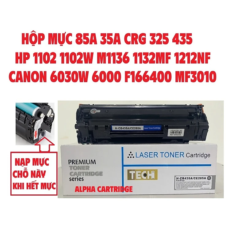 Hộp Mực 85A dành cho Canon F166400 F158200 6030w 6000 6030 3050 6018 312-325 MF 3010 Mực in HP P1102 P1102w M1136 M1130 M1132mf M1212nf M1139 -Có Lỗ Đổ Mực- Hàng chính hãng Alpha Cartridge