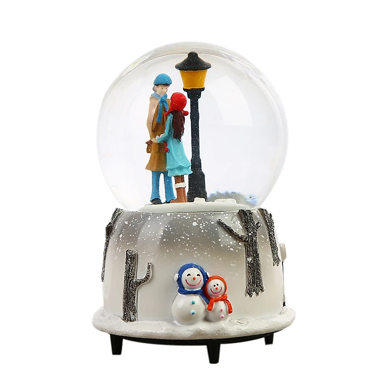 - Phía trên quả cầu là khung cảnh đôi tình nhân tay trong tay, kề bên nhau dưới ánh đèn điện. Khi bạn bật công tắc ở dưới để của hộp nhạc, những bản nhạc sẽ vang lên du dương nhẹ nhàng kèm theo đó là bầu trời tuyết rơi tuyệt đẹp.