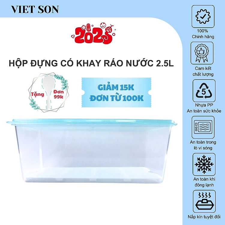 Hộp Nhựa Thực Phẩm Chữ Nhật Nắp Kín Có Khay Ráo Nước Việt Son 2.5L