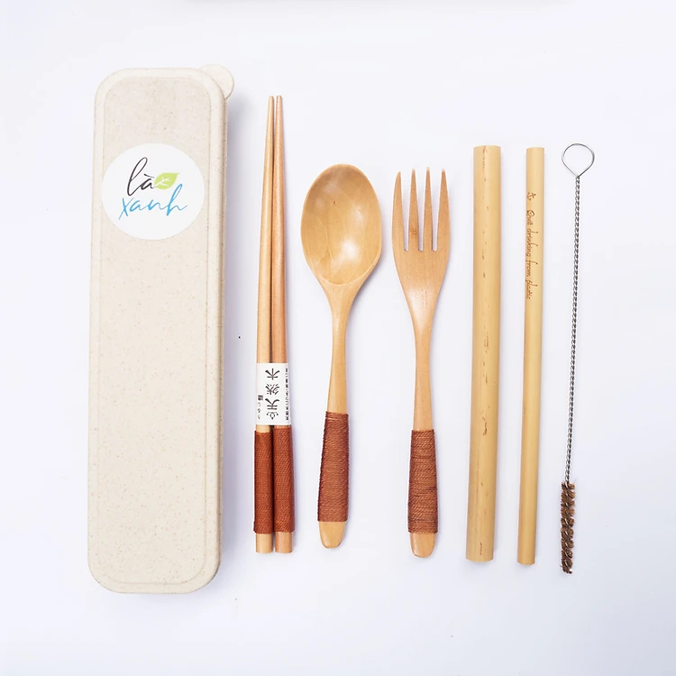 Hộp Ống Hút tre + Bộ Muỗng Nĩa Gỗ Cho Bé - Là Xanh