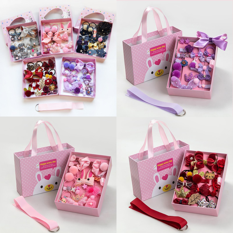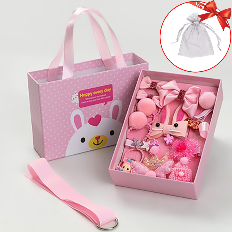 Hộp quà 18 món cột tóc, kẹp tóc nhiều kiểu dễ thương cho bé gái làm quà sinh nhật - Tặng túi voan dây rút