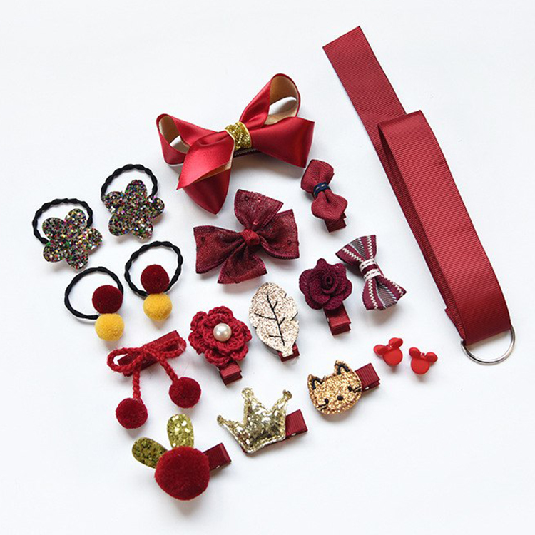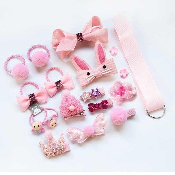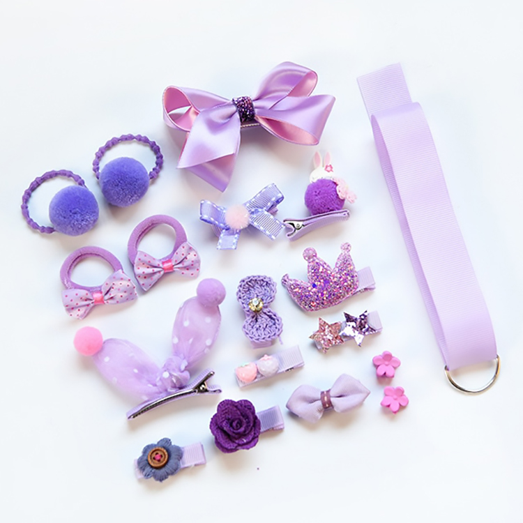 Bộ gồm 18 món bao gồm đủ loại cột tóc, kẹp tóc, kẹp mái... tha hồ cho bé thay đổi mỗi ngày.