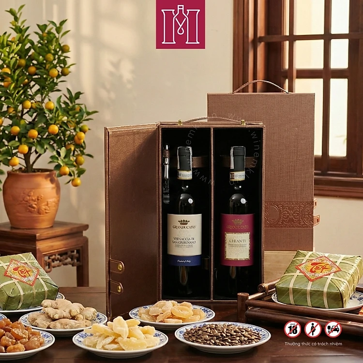 Hộp quà 2 chai rượu vang Ý nhập khẩu Bersano Granducato 750ml chính hãng, kèm hộp da đôi nâu có phụ kiện - hộp quà tặng Tết, tặng khách hàng, tặng đồng nghiệp