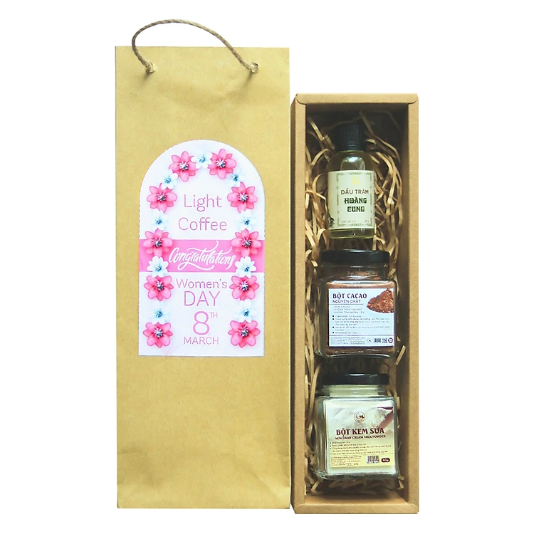 Hộp Quà 8/3 Light Coffee PN2 (3 Món) được thiết kế sang trọng, góc cạnh, đóng gói tỉ mỉ, chắc chắn, thích hợp làm quà tặng mẹ, vợ và người yêu nhân ngày Quốc tế Phụ nữ. Hộp quà tặng gồm 3 sản phẩm được chọn lọc tinh tế, ý nghĩa, tốt cho sức khỏe giúp bạn gửi gắm yêu thương đến những người phụ nữ mà bạn yêu quý, trân trọng.
