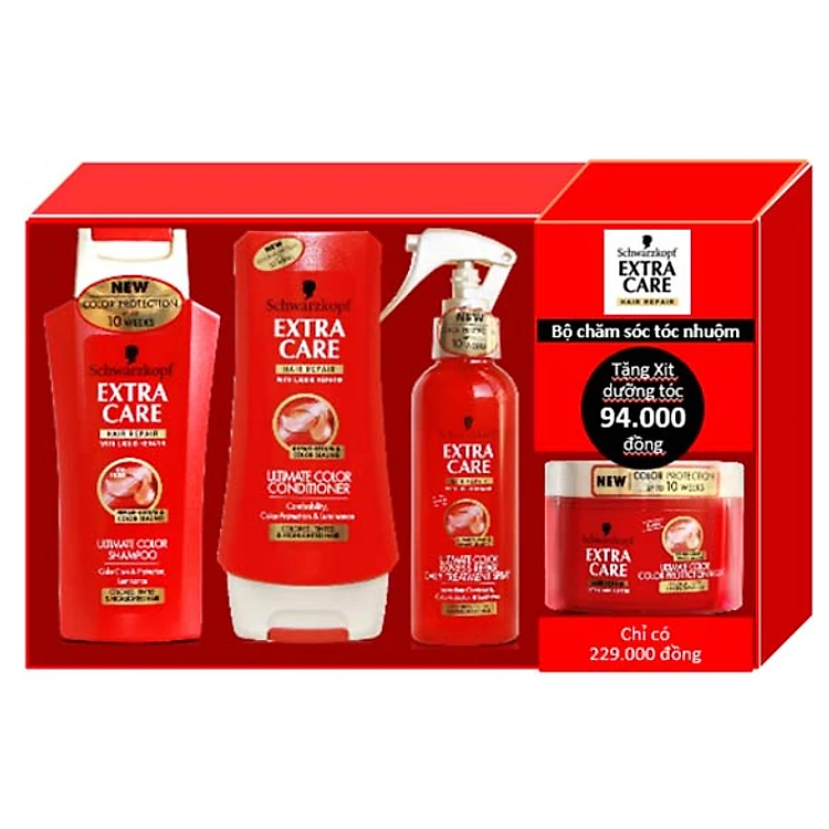 Hộp Quà Extra Care Chăm Sóc Tóc Nhuộm - Bộ sản phẩm có công thức đặc biệt với Serum phục hồi và màng chắn tia UV bảo vệ tóc khỏi hư tổn, giữ tóc bền màu trong suốt 10 tuần sau khi nhuộm. Bộ sản phẩm với các thành phần hóa học và hương tự nhiên mang đến cho bạn gái mái tóc óng ả, bền màu.