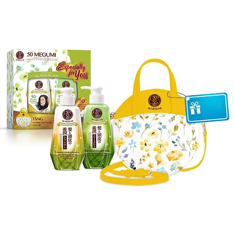 Hộp Quà Ngăn Rụng Tóc 50 Megumi Hair Fall Control (Dầu Gội 250ml + Dầu Xả 250ml) + Túi Da Họa Tiết Vintage 50 Megumi