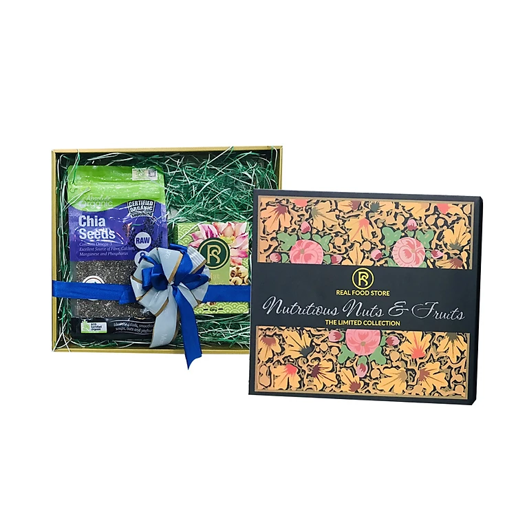 Real Food đã thiết kế 1 hộp hạt dinh dưỡng mang phong cách sang trọng và lịch sự. Nội dung trong hộp gồm 2 món: Túi hạt chia 400g và Hộp sen sấy 100g