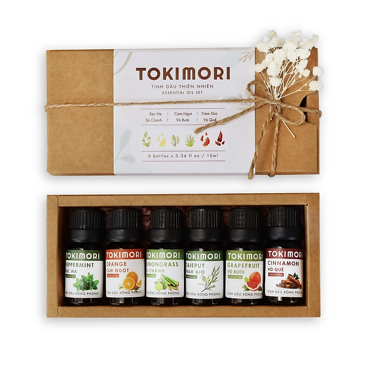 Hộp Quà Tặng Tinh Dầu TOKI MORI Cao Cấp, Xuất Khẩu Nhật Bản 6x10ml, Nguyên Chất Thiên Nhiên - Cam Ngọt, Bạc Hà, Sả Chanh, Vỏ Quế, Tràm Gió, Vỏ Bưởi