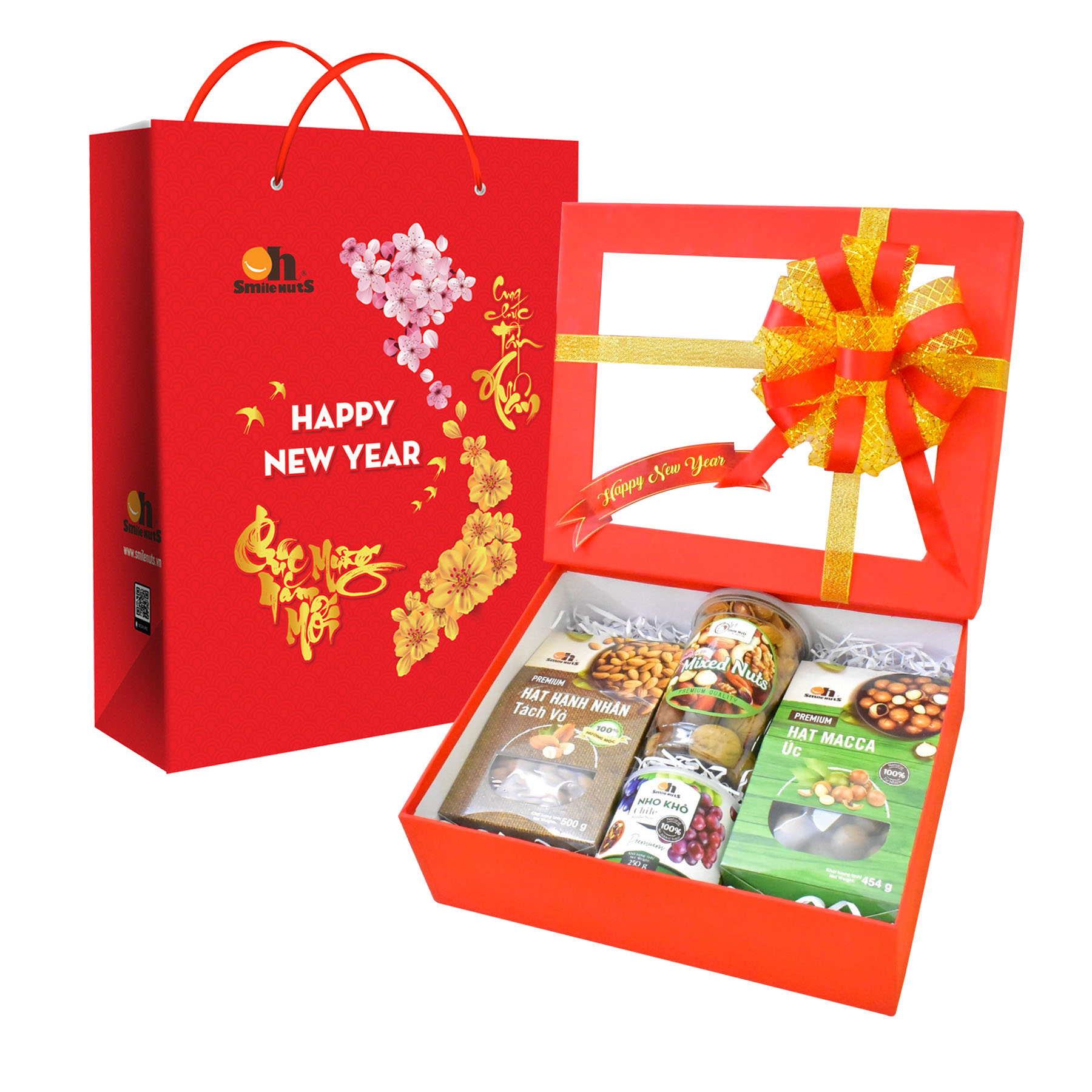 Bộ Hộp Quà Tết Smile Nuts (4 món) với các sản phẩm bên trong là các loại hạt dinh dưỡng và đắt nhất Thế Giới, không chỉ mang đến lợi ích sức khỏe cho người thưởng thức mà còn là món ăn vặt cao cấp và thơm ngon cho gia đình, nhất là dịp lễ Tết.