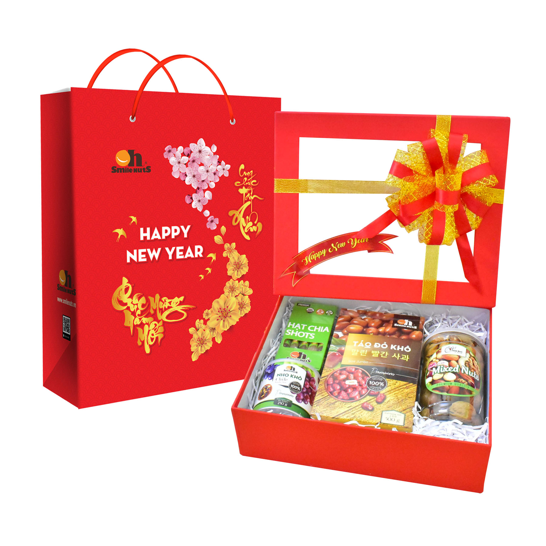 Hộp Quà Tết Cao Cấp Hạt Dinh Dưỡng Smile Nuts - Loại C (Táo đỏ khô, Nho khô mix Chile, Mix 3 loại hạt và Hạt Chia shots)