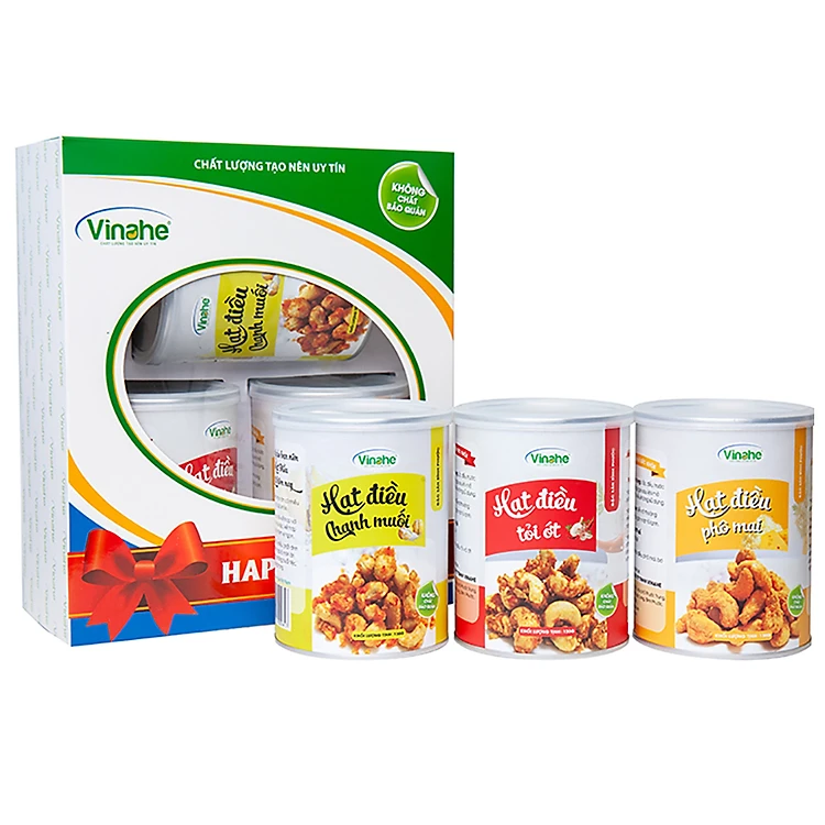 Một hộp quà Tết gồm có 3 lon bánh/ hạt điều bất kỳ, hộp quà Tết hạt điều Vinahe toát lên sự sang trọng, tinh tế phù hợp với mọi đối tượng mà bạn muốn tặng, biếu. Đặc biệt, đây là những sản phẩm mới được tung ra thị trường nên sẽ tạo được hiệu ứng cao vì đa phần mọi người đều thích và hứng thú với những món quà mới lạ, độc đáo.