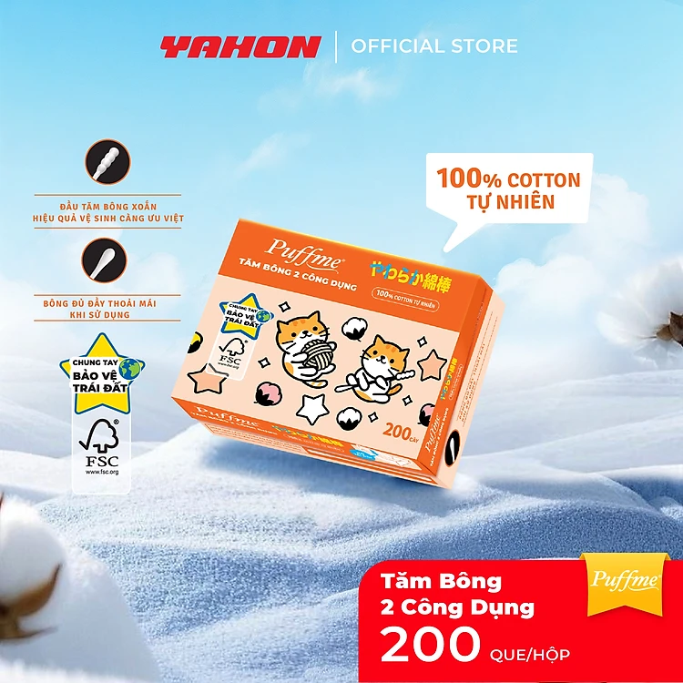 Hộp Tăm Bông 2 Công Dụng PUFFME, 200 Que/Hộp
