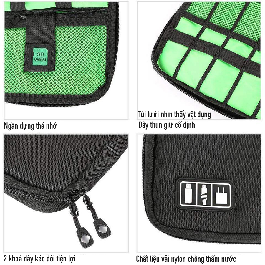 Với hộp túi đa năng 2 mặt chia nhiều ngăn đựng phụ kiện công nghệ, bạn không còn phải mất nhiều thời gian tìm kiếm các vật dụng cần thiết như cáp sạc, tai nghe, đầu chuyển cổng sạc,