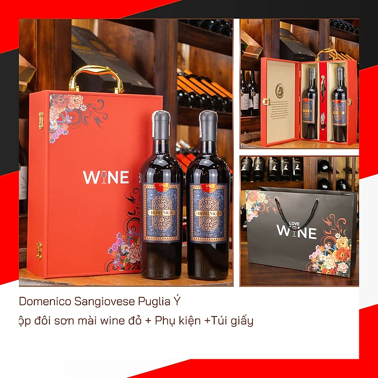Hộp sơn mài wine đỏ 2 chai rượu vang Ý Domenico Sangiovese Puglia