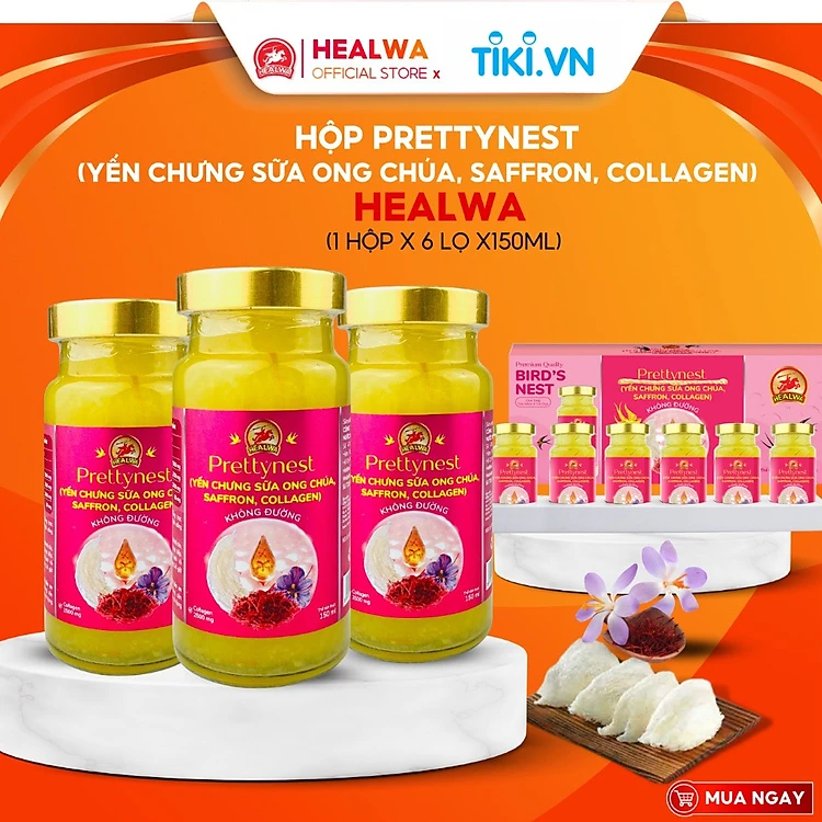 Hộp yến chưng sữa ong chúa Saffron Collagen Prettynest Healwa vị ngọt tự nhiên từ cỏ ngọt (1 hộp x 6 lọ x 150ml)