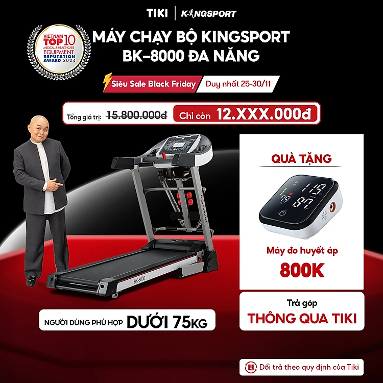 Máy chạy bộ KINGSPORT BK-8000 đa năng, thảm chạy rộng chống trơn, kèm đai massage và thanh gập bụng, cân nặng phù hợp từ dưới 75kg