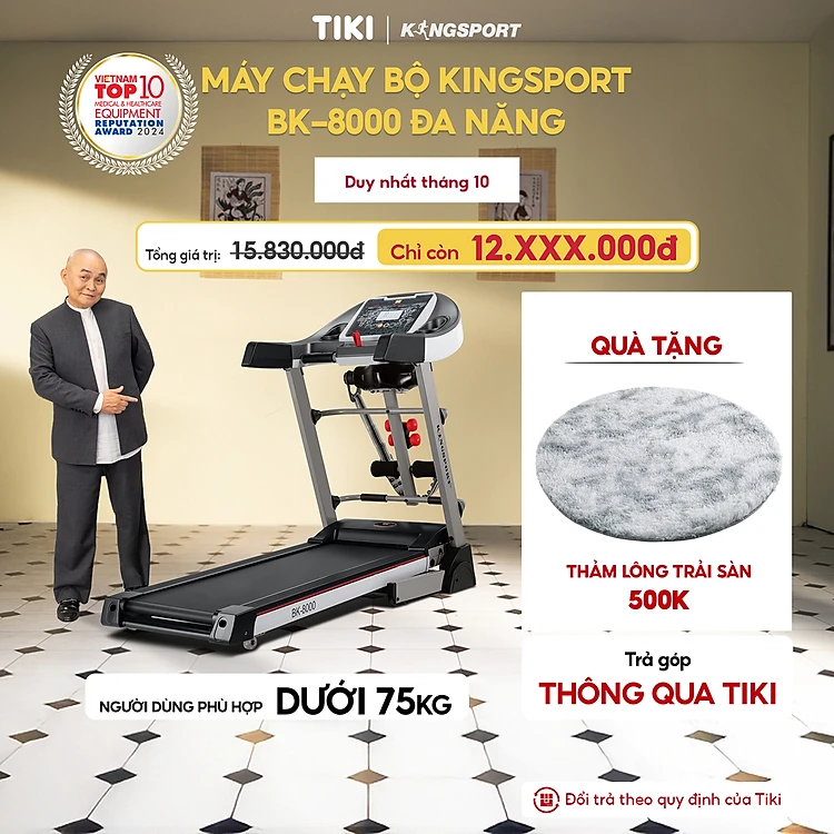 Máy chạy bộ KINGSPORT BK-8000 đa năng, thảm chạy rộng chống trơn, kèm đai massage và thanh gập bụng, cân nặng phù hợp từ dưới 75kg