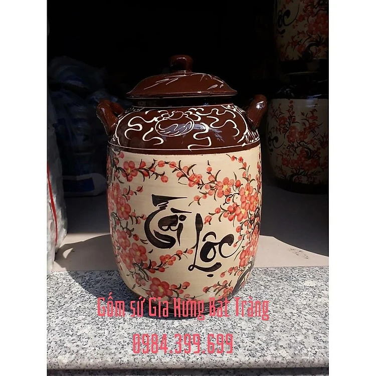 Hũ đựng gạo tài lộc hoa đào gốm Gia Hưng Bát Tràng