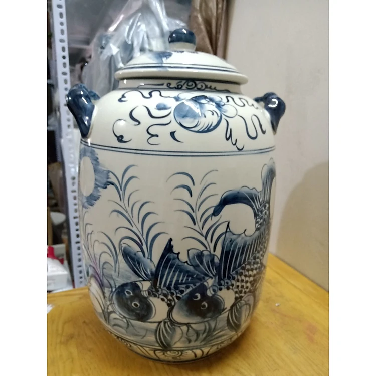 Hũ đựng rượu gạo gốm sứ Bát Tràng vẽ cá chép loại 15L