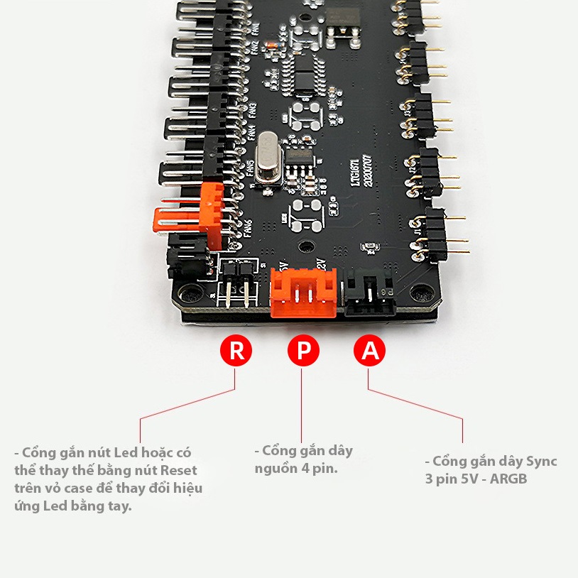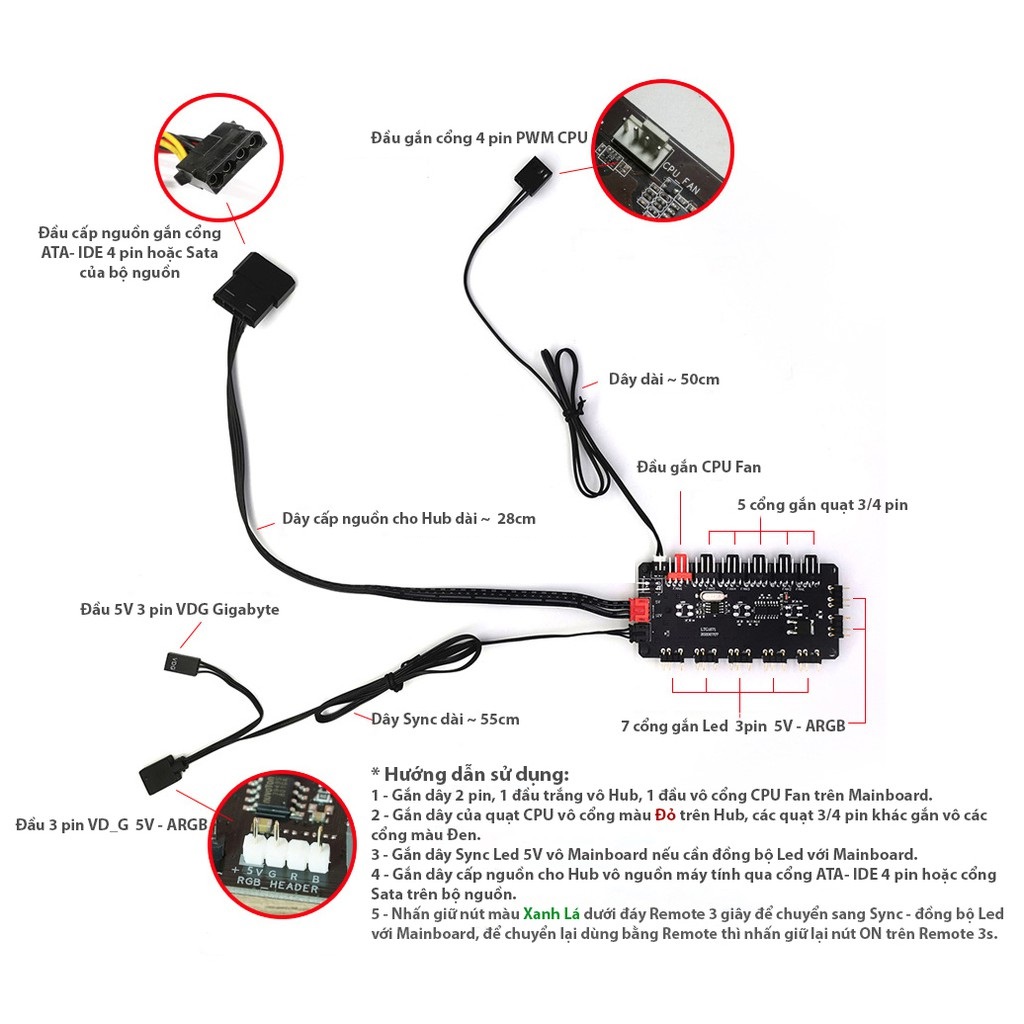 - Hub dùng cho các quạt có cổng 3/4 pin, không có led hoặc có led 5V-ARGB 3 pin. Sync đồng bộ với mainboard
