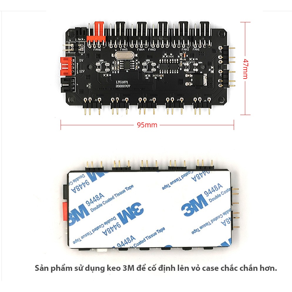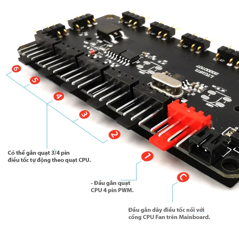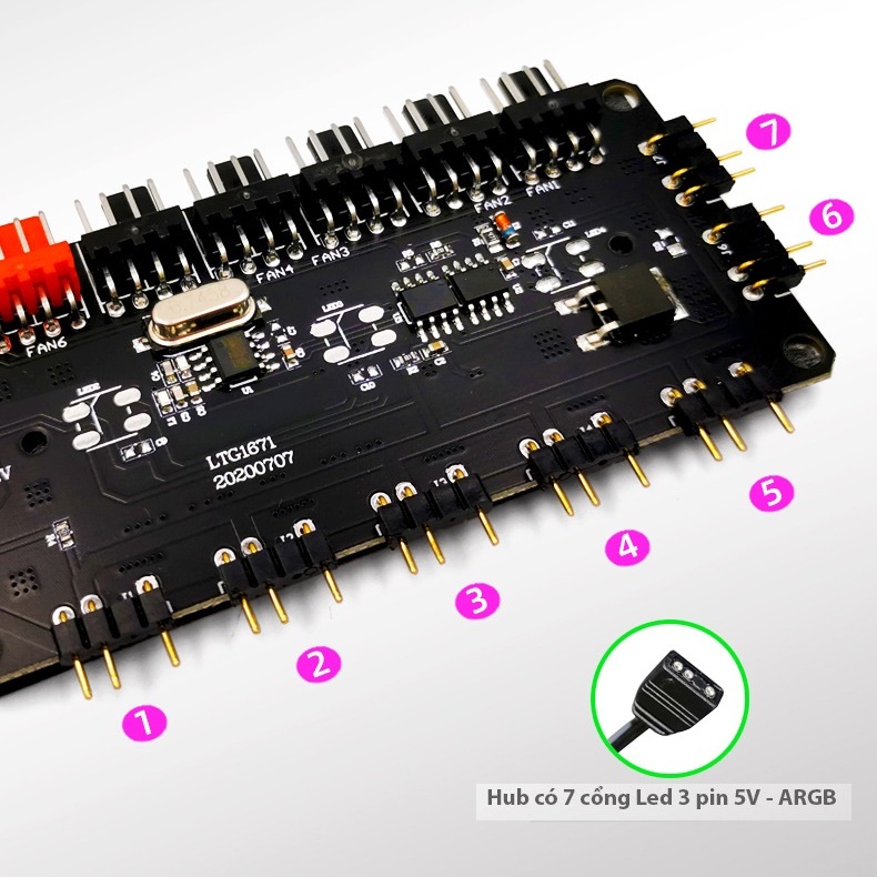 - Hub có 6 cổng 4 pin PWM gắn quạt và 7 cổng Led 3 pin 5V – ARGB.