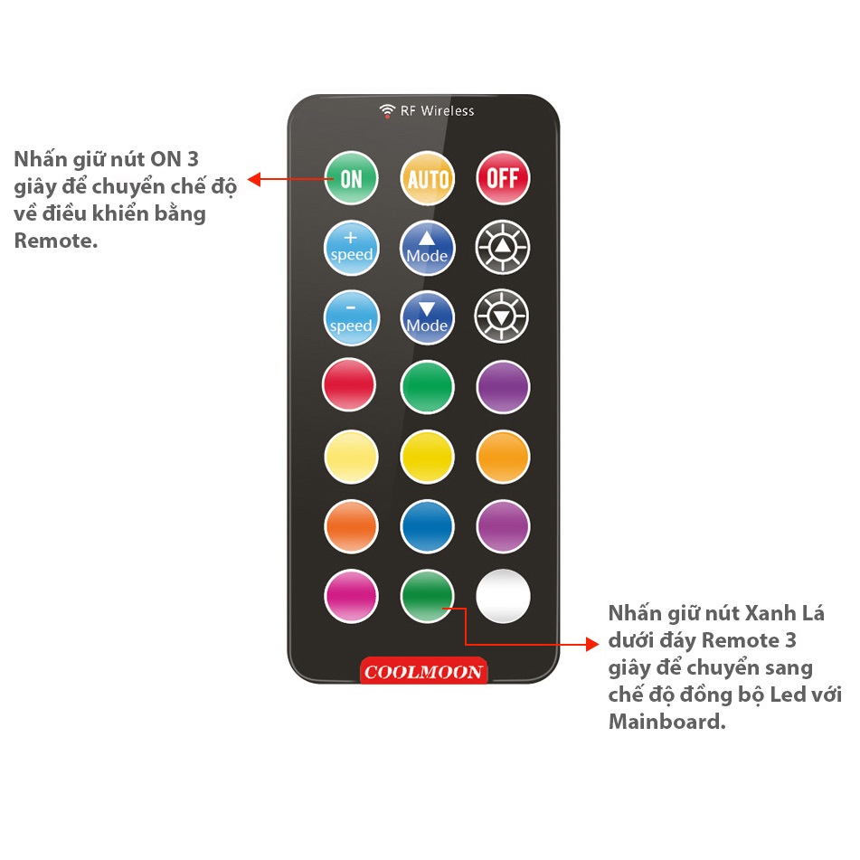 - Nhấn giữ nút màu Xanh Lá dưới đáy Remote 3 giây để chuyển sang Sync - đồng bộ Led với Mainboard, để chuyển lại dùng bằng Remote thì nhấn giữ lại nút ON trên Remote 3 giây