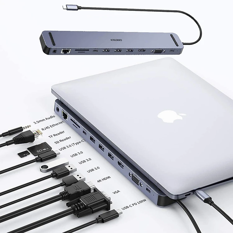Hub chia cổng sạc nhanh 100W Type-C đa năng 11 in 1 kiêm giá đỡ hiệu CHOETECH M20 (cổng sạc nhanh Type-C PD 3.0, 3 cổng USB 3.0, cổng Data Type-C, AUX 3.5mm, cổng HDMI 4k, VGA 1080P, LAN RJ45, cổng thẻ nhớ SD/Micro SD) hàng chính hãng