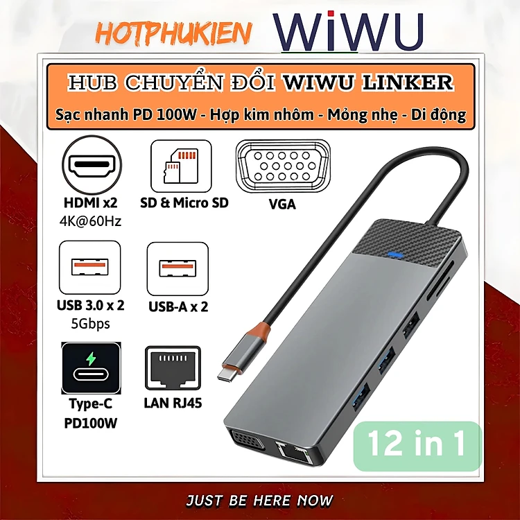 Hub chuyển đổi chia cổng USB-C 12in1 sạc nhanh 100W trang bị USB 3.0 +PD Type-C + Micro SD, SD + HDMI 4K@60Hz, LAN RJ45, VGA hiệu WIWU Linker 12in1 cho Macbook Laptop cho iPhone - Hợp kim nhôm, vừa sạc vừa xuất màn hình và truyền dữ liệu - Hàng nhập khẩu