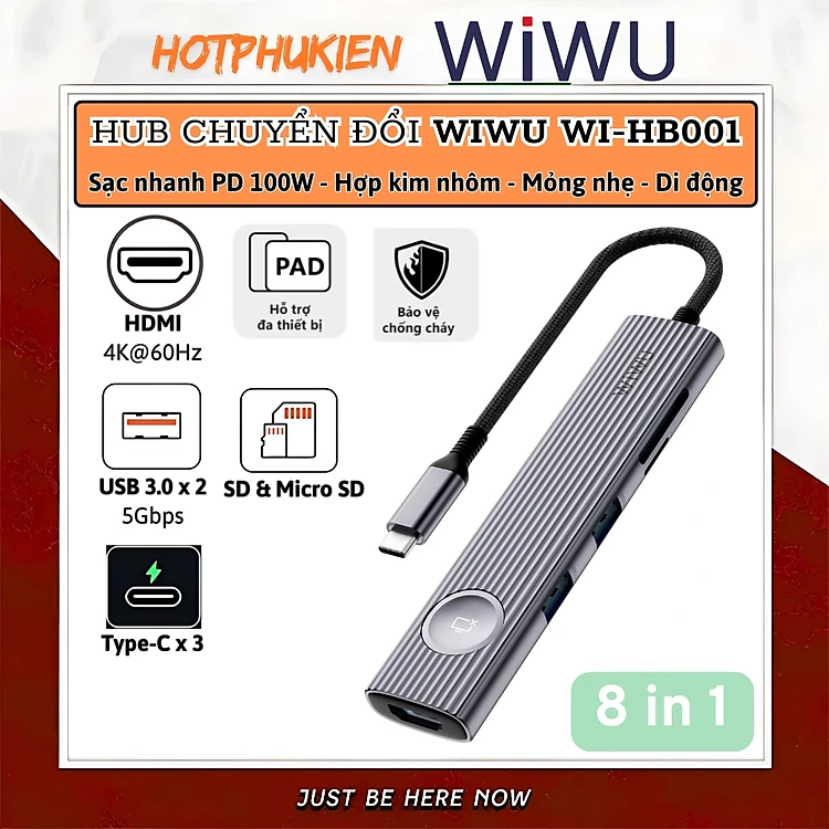 Hub chuyển đổi chia cổng USB-C 8in1 sạc nhanh 100W trang bị 2 USB 3.0 + 3 PD Type-C + Micro SD SD + HDMI 4K@60Hz hiệu WIWU Travel cho Macbook Laptop cho iPhone - Hợp kim nhôm, đa năng để vừa sạc vừa xuất màn hình và truyền dữ liệu - Hàng nhập khẩu