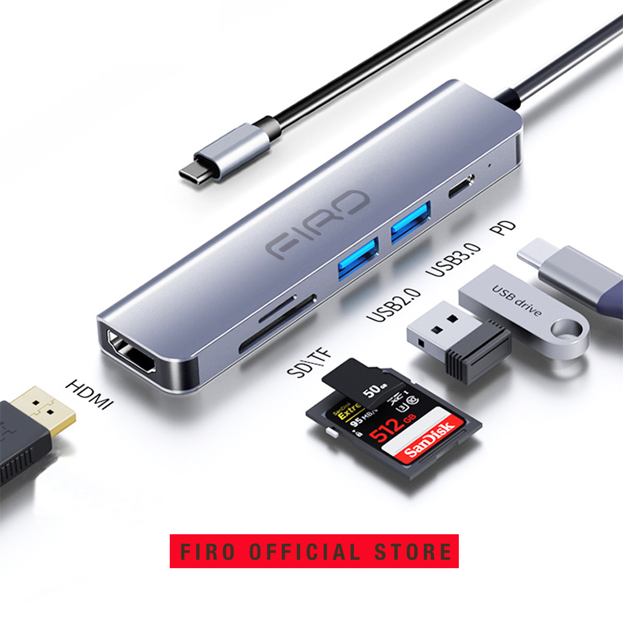 Hub Type-C To HDMI FIRO 6in1 Chuẩn HDTV - Hub Chuyển Đổi Type-C Chia 6 Cổng - 1 Cổng HDMI/HDTV 4K, 2 Cổng USB 3.0, 2 Khe Đọc Thẻ TF Và SD, 1 Cổng Sạc Nhanh Type C PD - Kết Nối Tốc Độ Cao - Dùng Cho Smartphone/Laptop/PC/Tivi/Playstation – Hàng Chính Hãng