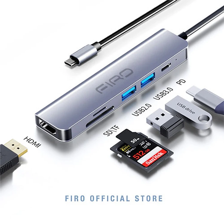 Hub USB Type-C To HDMI FIRO 6in1 Chuẩn HDTV - Hub Chuyển Đổi Type-C Chia 6 Cổng - 1 Cổng HDMI/HDTV 4K, 2 Cổng USB 3.0, 2 Khe Đọc Thẻ TF Và SD, 1 Cổng Sạc Nhanh Type C PD - Kết Nối Tốc Độ Cao - Hub USB FIRO – Hàng Chính Hãng
