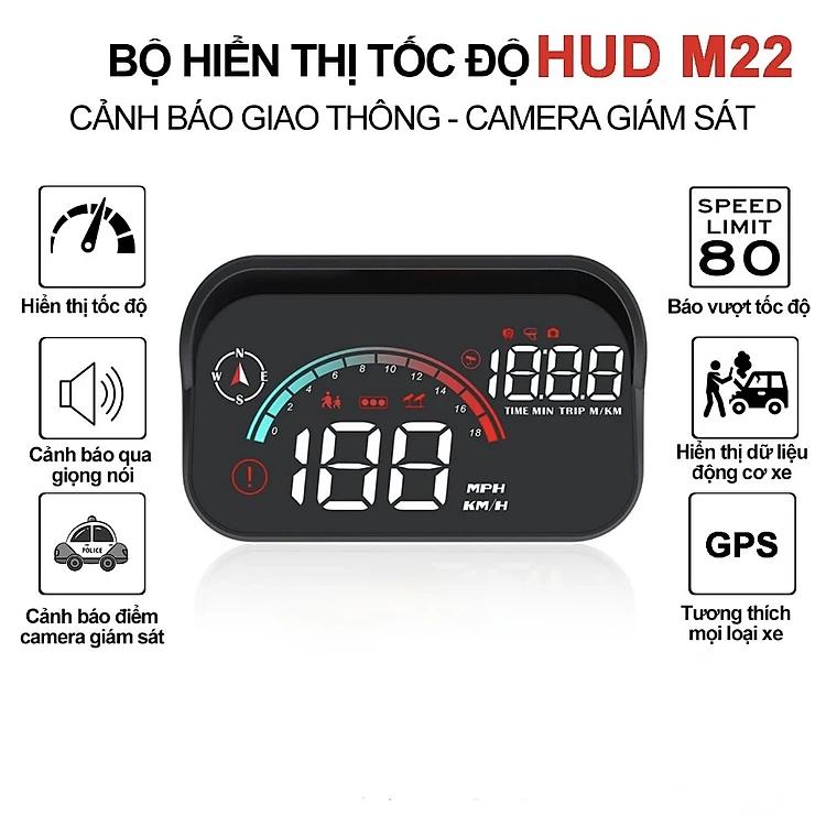 HUD M22 Hiển Thị Tốc Độ Trên Kính Lái Ô Tô Cảnh Báo Giọng Nói Tiếng Việt – Kết Nối OBD2 & GPS