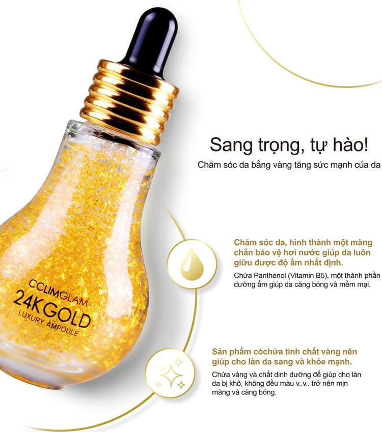 - Huyết Thanh Vàng 24K Nguyên Chất CCLIMGLAM 24K Gold Luxury Ampoule (50ml) chứa thành phần với hàm lượng cao vàng nguyên chất 99.99% giúp hình thành màng bảo vệ trên bề mặt da, thải độc và cung cấp dinh dưỡng cho da, dưỡng ẩm, tái tạo và làm trắng da.