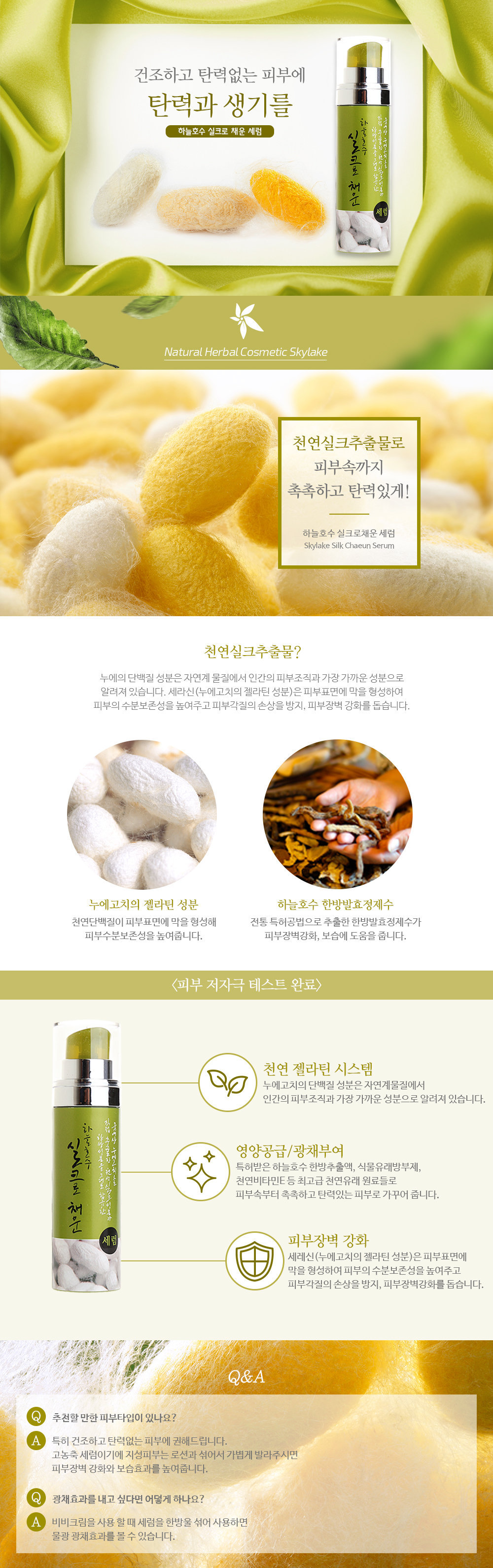 Protein Cocoon đã được biết đến như là chất tương tự như hầu hết đến các mô da người trong tự nhiên. Chất 'Serecin' trong kén tằm để ràng buộc các sợi kén với nhau tạo thành một hàng rào mỏng trên da để tăng khả năng của da để giữ độ ẩm, ngăn ngừa tổn thương da và tăng cường chức năng bảo vệ da.