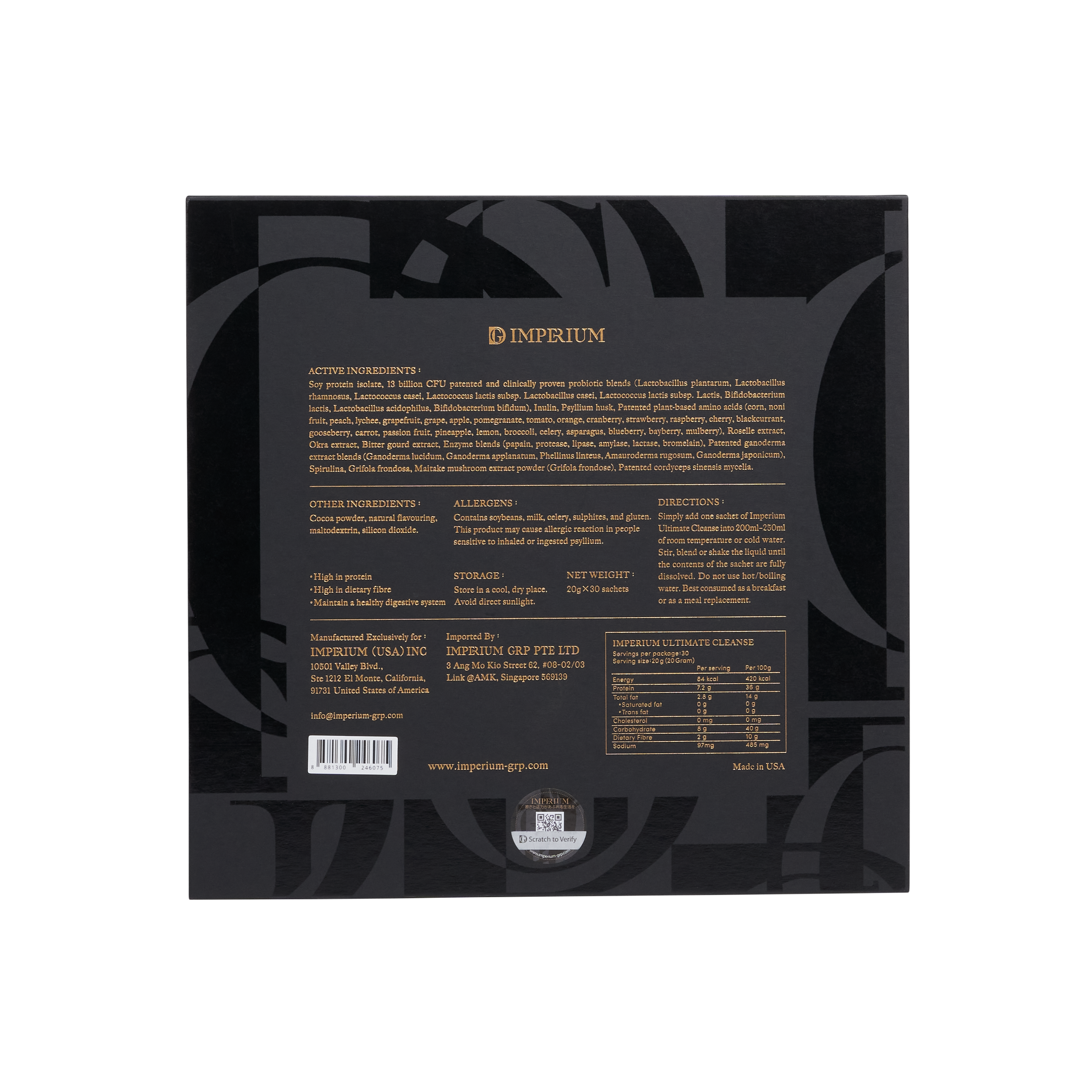 Cuộc sống bận rộn khiến chúng ta thường xuyên ăn thức ăn nhanh không lành mạnh hoặc đôi khi quên ăn bỏ bữa. Imperium Ultimate Cleanse là sản phẩm thay thế bữa ăn tiện lợi được làm bằng các nguyên liệu chất lượng cao và có hàm lượng protein, carbohydrate và chất xơ cao để giúp cung cấp một bữa ăn cân đối và đầy đủ chất dinh dưỡng suốt cả ngày. Nó cũng chứa nhiều vitamin sẽ giúp tối ưu hóa mức năng lượng cho cả ngày năng động. Ultimate Cleanse cung cấp mọi thành phần mà cơ thể sẽ cần chỉ trong một lần uống.