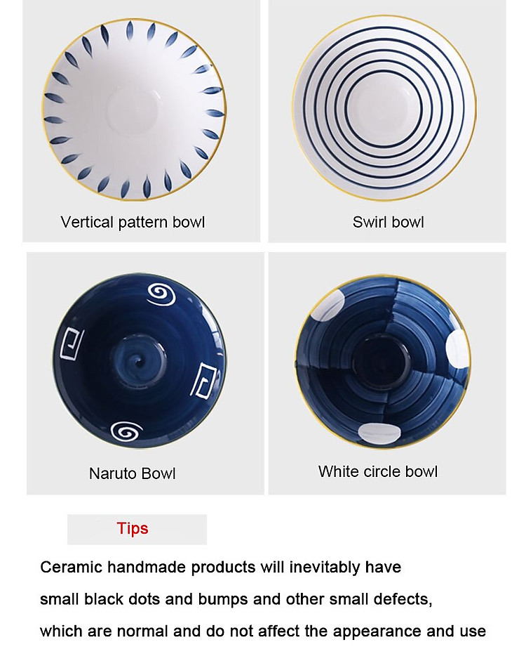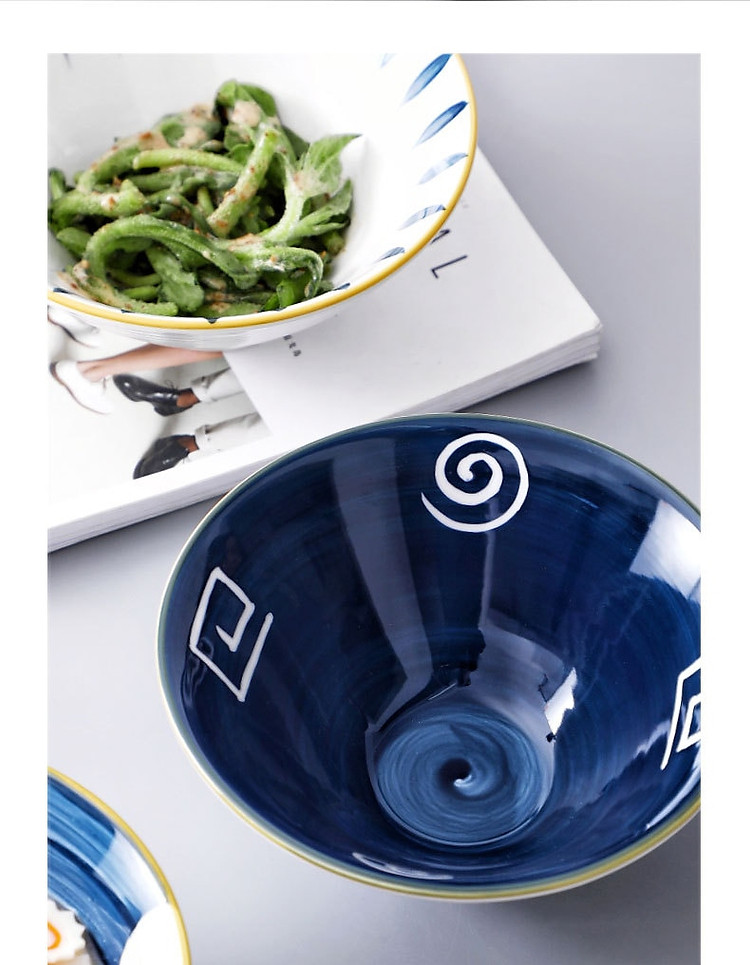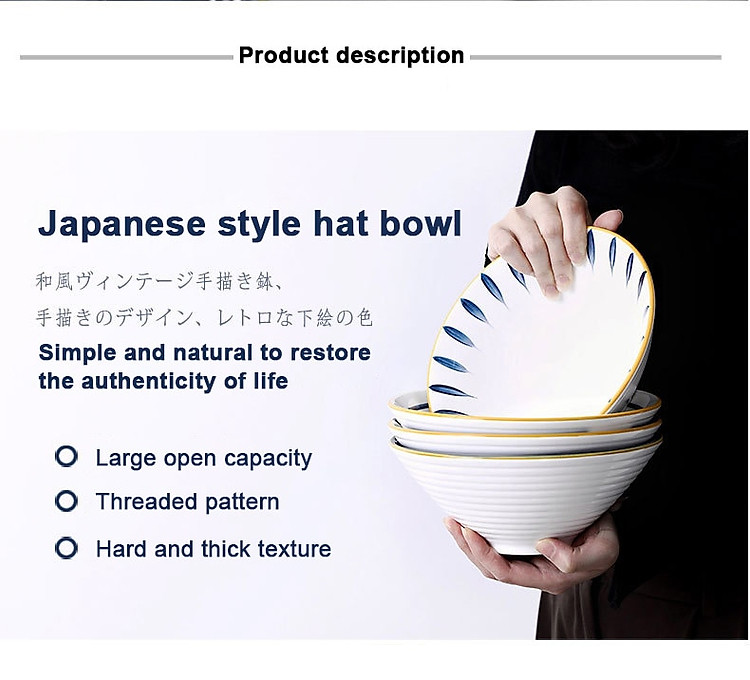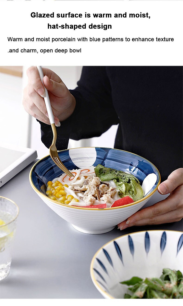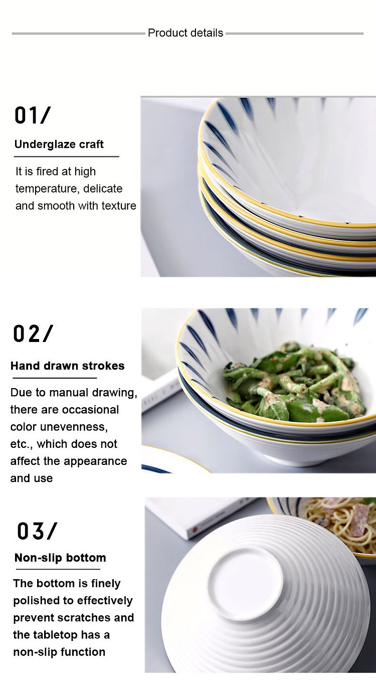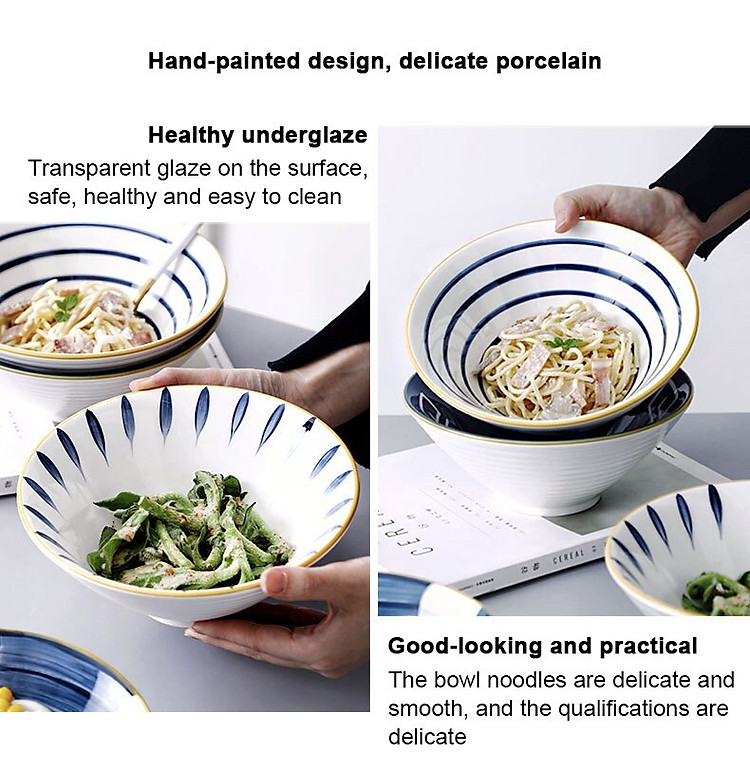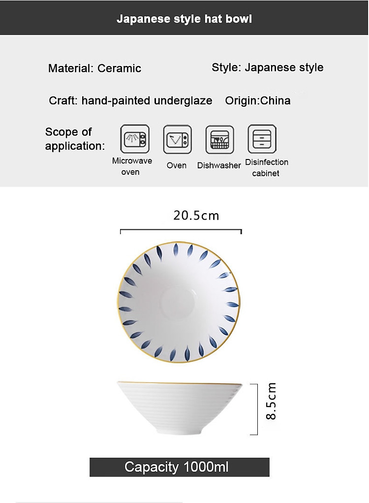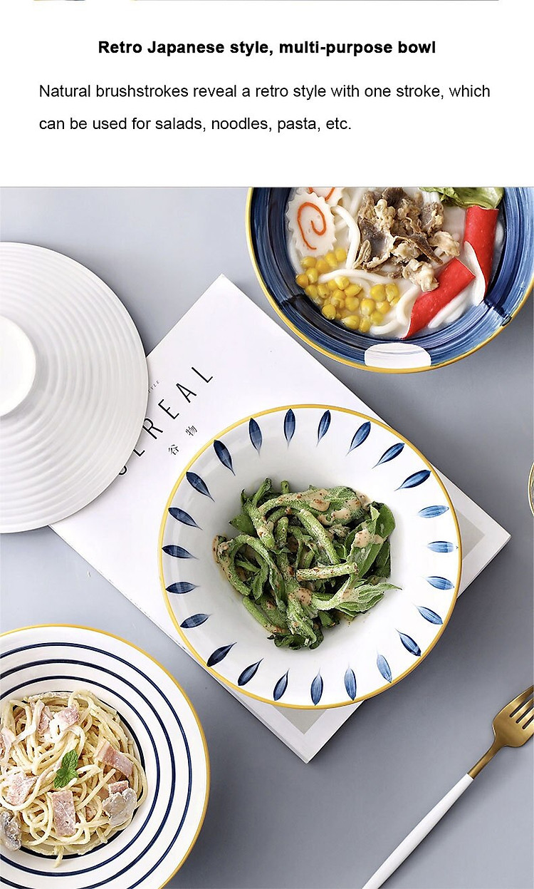 Product name: Japanese ceramic bowl Material: Porcelain Style: Japanese simple Process: Under the glaze Size: 8 inches (diameter 20.5cm high 8.5cm) characteristic: The product is smooth without burrs, and has a comfortable taste Microwave safe, smooth surface and easy to clean First-class porcelain, high temperature spray paint, maintain color fastness Fusion of creativity and fashion High-quality non-toxic porcelain materials Various sizes to meet family needs Good anti-slip and anti-scaling performance It can be used for dinner. Salad and breakfast Exquisite gifts for relatives and friends are also very suitable for hotels, restaurants or bars