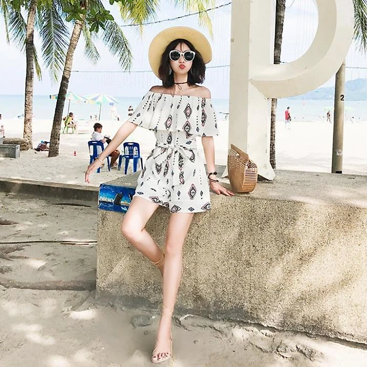 Jumpsuit trễ vai họa tiết thổ cẩm dễ thương thời trang đi biển Hàng nhập cao cấp (màu trắng)