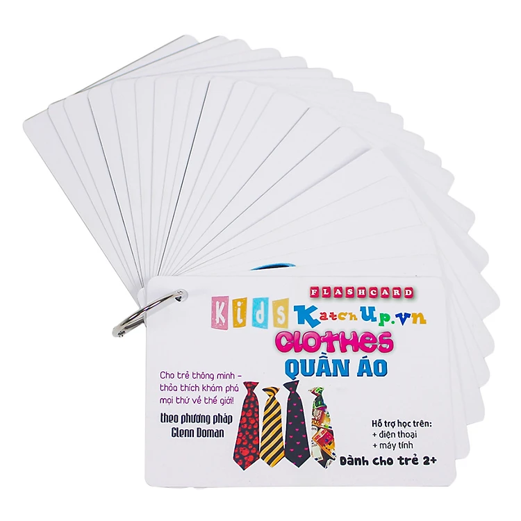 - KatchUp Flashcard Tiếng Anh Cho Bé - Quần Áo - High Quality gồm khoảng 20 thẻ in từ vựng. Trong vô vàn những phương pháp ghi nhớ từ vựng hiện nay thì phương pháp học từ vựng bằng Flashcard là cách tốt giáo dục sớm cho trẻ từ 0-6 tuổi. Ngoài ra, bộ KatchUp Flashcard Tiếng Anh Cho Bé sử dụng giấy màu trắng dày, chất lượng ép plastic hai mặt và tặng kèm code học online để phụ huynh và bé có thể vừa học vừa chơi ghi nhớ từ nhanh chóng không gây nhàm chán.