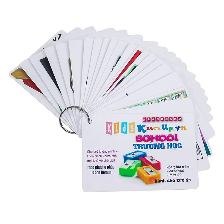 • KatchUp Flashcard Tiếng Anh Cho Bé – Trường học - High Quality gồm khoảng 20 thẻ in từ vựng. Trong vô vàn những phương pháp ghi nhớ từ vựng hiện nay thì phương pháp học từ vựng bằng Flashcard là cách tốt  giáo dục sớm cho trẻ từ 0-6 tuổi. Ngoài ra, bộ KatchUp Flashcard Tiếng Anh Cho Bé sử dụng giấy màu trắng dày, chất lượng ép plastic hai mặt và tặng kèm code học online để phụ huynh và bé có thể vừa học vừa chơi ghi nhớ từ nhanh chóng không gây nhàm chán.