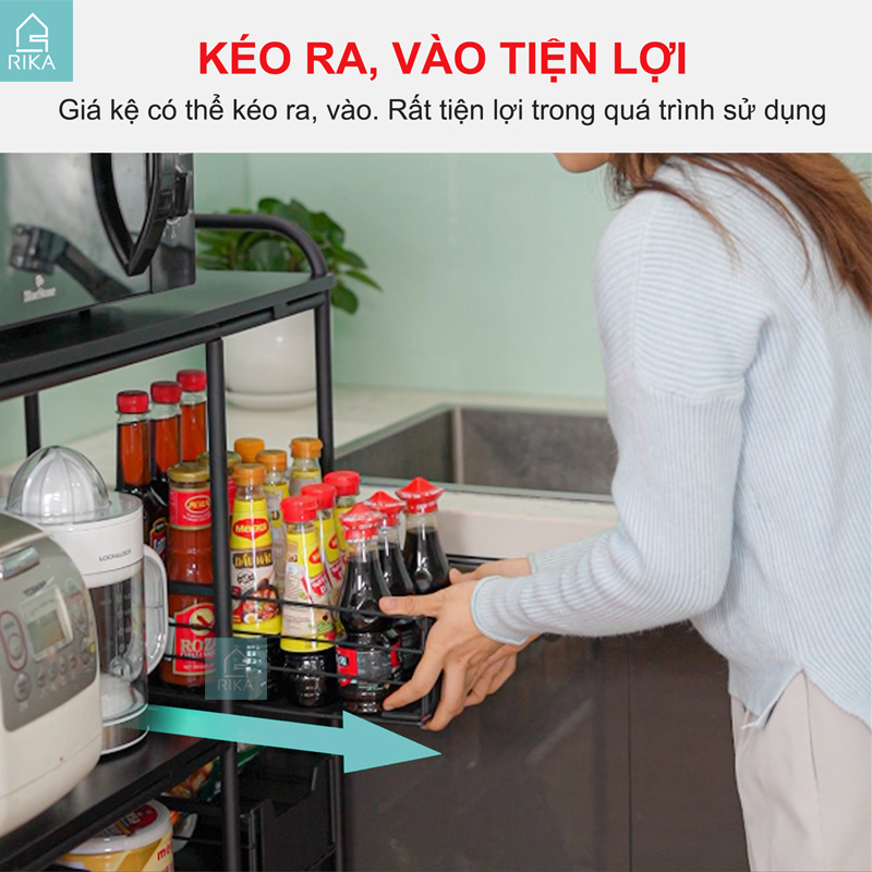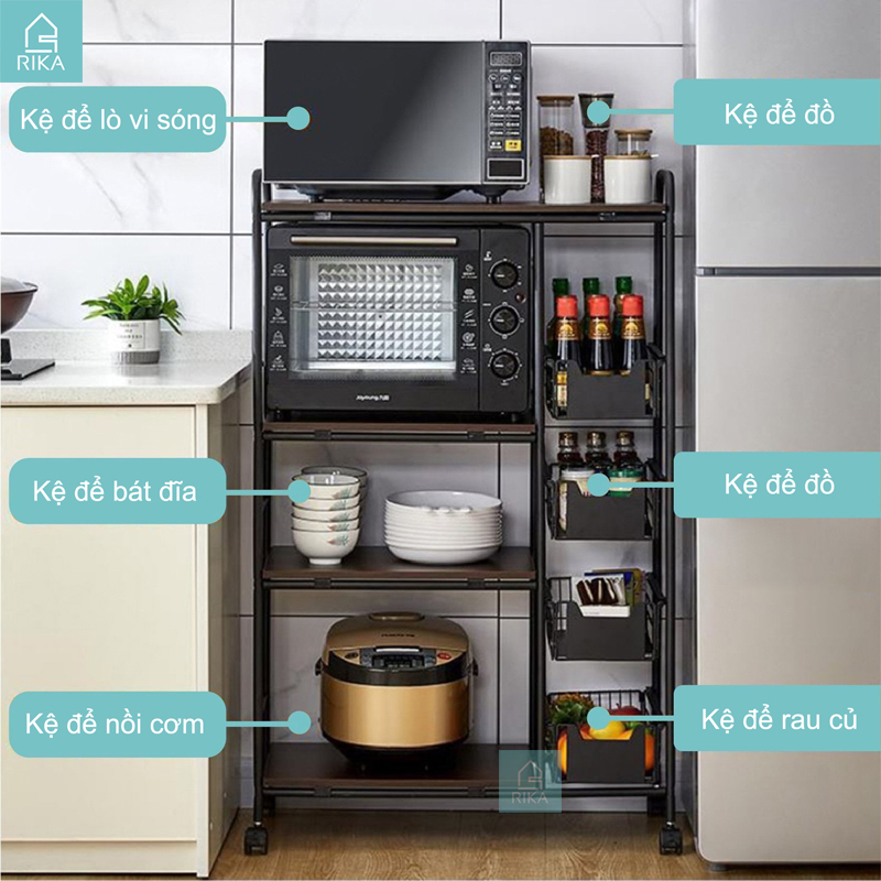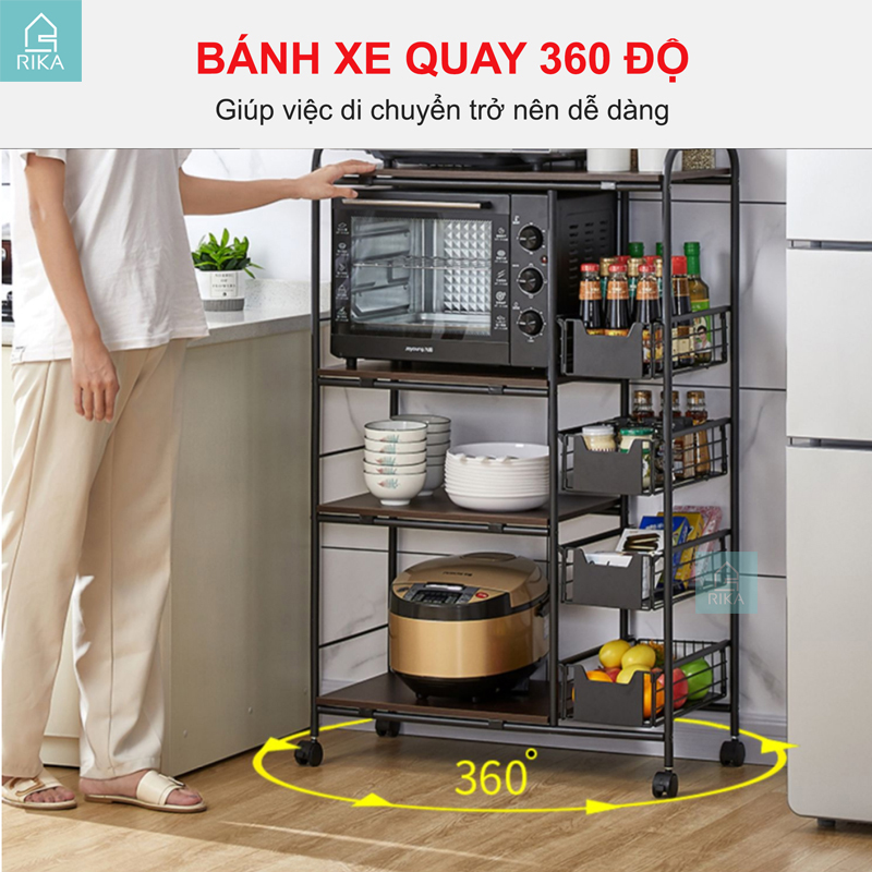 5. Không chỉ có kệ để đồ Rika còn thiết kế thêm 4 ngăn kéo để bát đĩa, kệ da vị, hoa quả siêu tiện lợi.