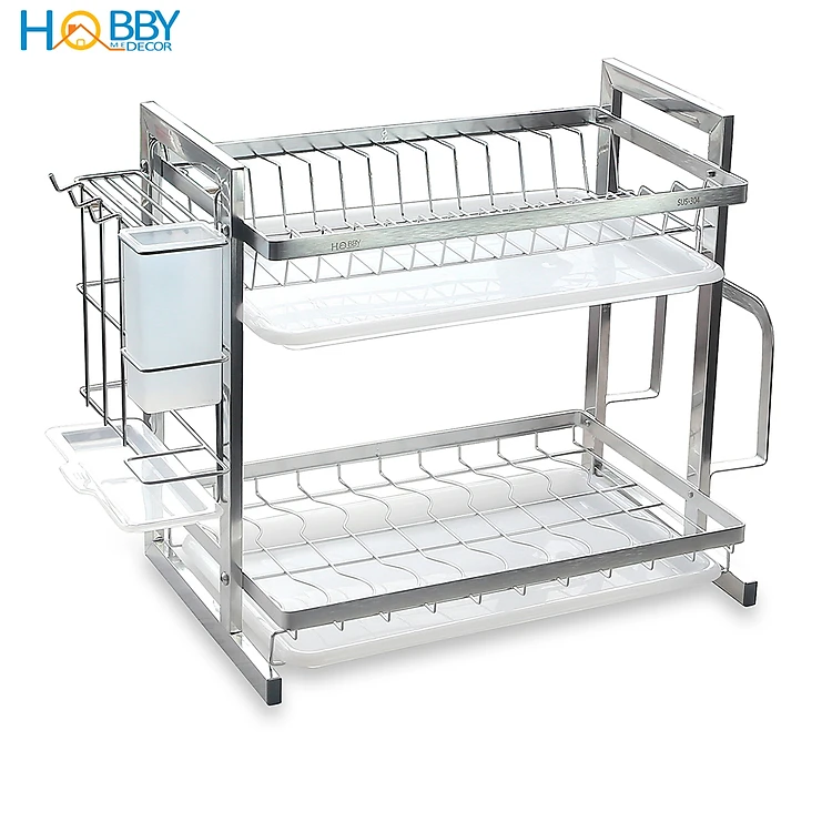 Kệ chén đa năng 2 tầng inox 304 Hobby Home Decor KC2T kèm khay hứng nước, ống đũa, giá treo thớt không rỉ sét