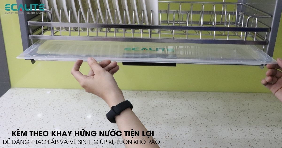 Giá bát nâng hạ inox Ecalite EL-BL800W còn được kèm theo khay hứng nước tiện lợi, chất liệu nhựa cao cấp. Khay hứng nước có thể tháo lắp dễ dàng khi vệ sinh và giúp giữ lại nước thừa của chén đĩa sau khi rửa xong, giúp tủ bếp tránh được tình trạng ẩm mốc. Phụ kiện đi kèm này giúp làm tăng tính hữu ích cho sản phẩm.