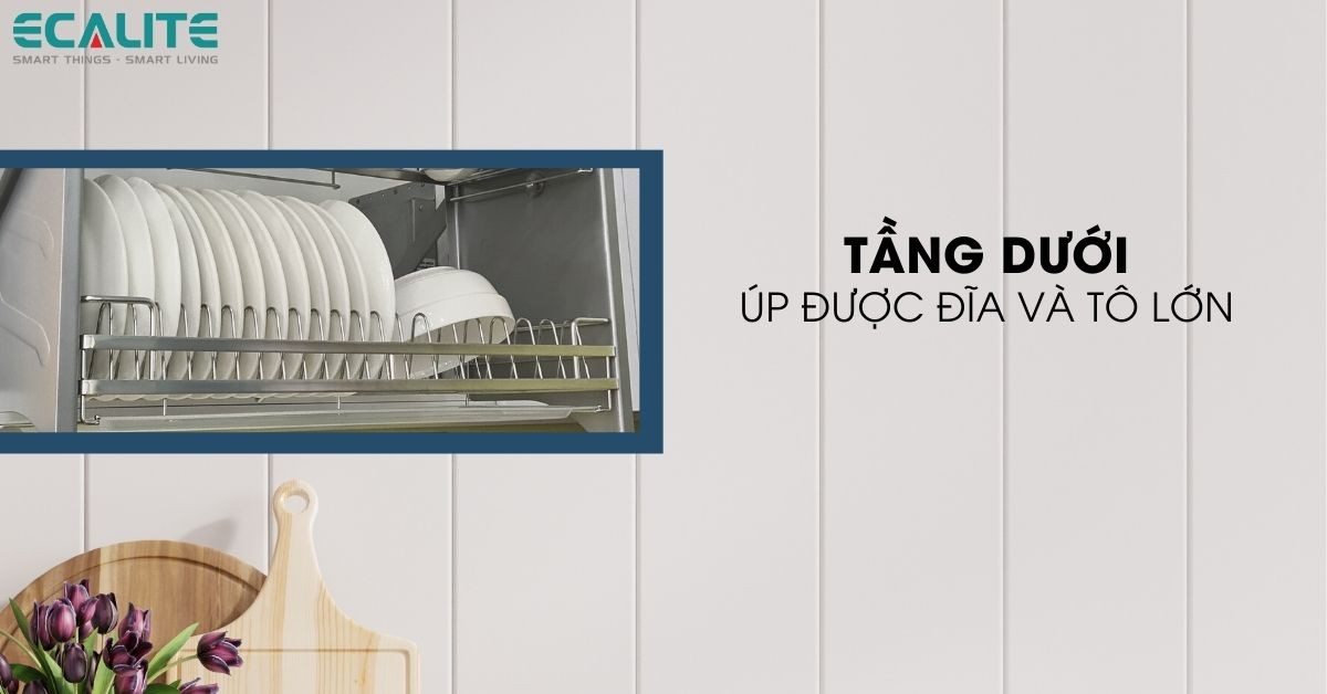 Tầng dưới của sản phẩm được dùng để úp đĩa hoặc tô lớn, thông thường sẽ dùng để úp đĩa nhiều hơn. Các thanh nan với khoản cách nhất định giúp giữ đĩa luôn trong tình trạng thẳng đứng riêng rẽ từng cái một, không va chạm nhau giúp người dùng an tâm sử dụng. Điều này giúp việc sắp xếp đĩa một cách khoa học và gọn gàng hơn, đem đến sự tối ưu cho không gian bếp cũng như nâng tầm căn bếp của gia đình.