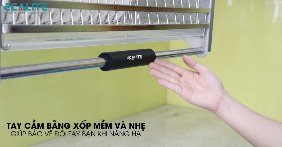 Điểm cộng của sản phẩm này là phần tay cầm được bọc thêm một lớp xốp mềm màu đen nên khi sử dụng giá bát nâng hạ bạn sẽ có cảm giác êm ái mà không bị trơn trượt khi nâng lên hạ xuống, rất tiện lợi trong quá trình sử dụng. Lớp bọc xốp tay cầm được thiết kế in chữ thương hiệu Ecalite tạo điểm nhấn cho sự sang trọng, tin dùng.