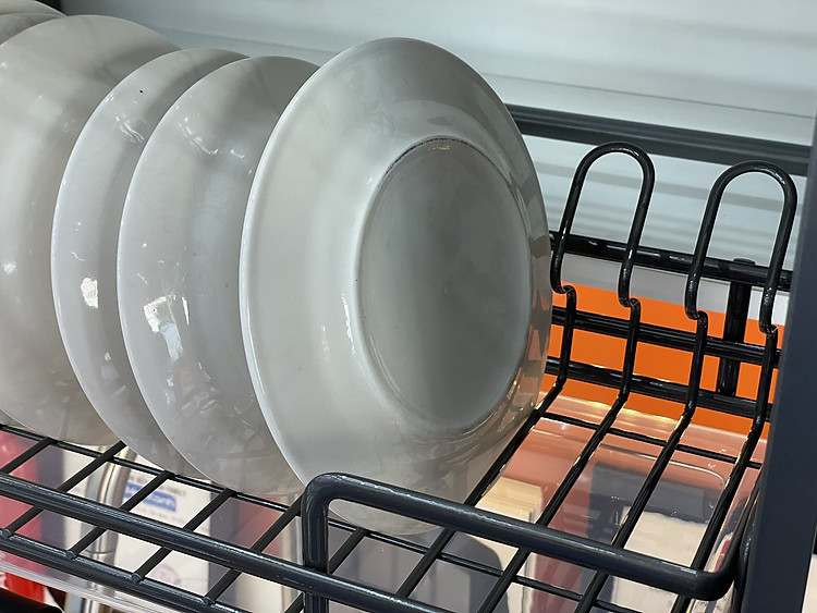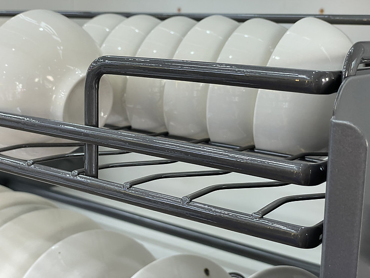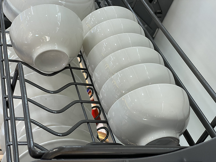 Khay đựng chén phía trên của kệ được chia thành các rãnh phù hợp với các loại chén bát thông thường trong gia đình Việt Nam.